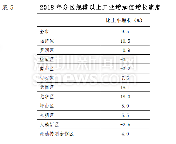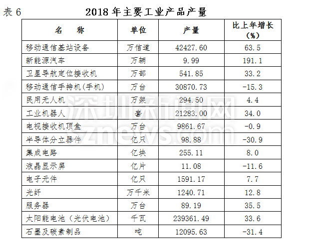 2018年,深圳全部工业增加值9254.00亿元,比上年增长9.0%。规模以上工业增加值增长9.5%。在规模以上工业中,国有企业增加值下降21.4%;集体企业下降5.6%;股份制企业增长12.8%;外商及港澳台商投资企业增长3.8%。分轻重工业看,轻工业增加值增长6.2%;重工业增加值增长10.2%。