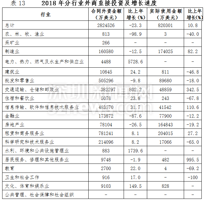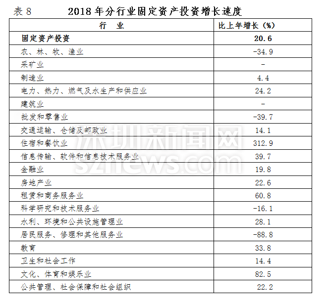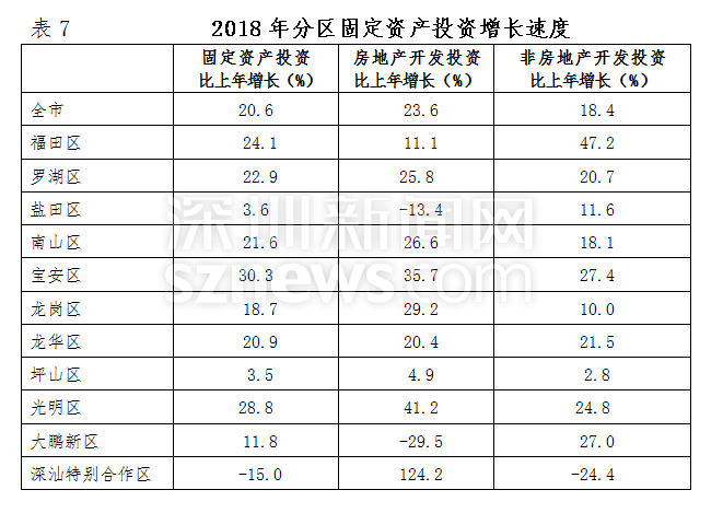 2018年,深圳全市固定资产投资比上年增长20.6%。其中,房地产开发投资增长23.6%;非房地产开发投资增长18.4%。分投资主体看,国有经济投资增长36.7%;民间投资增长12.5%;港澳台商经济投资下降22.6%;外商经济投资增长30.3%。