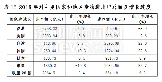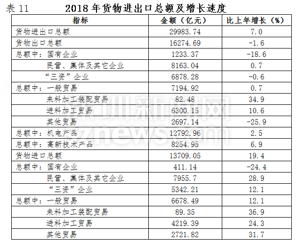 全年货物进出口总额29983.74亿元,比上年增长7.0%。其中出口总额16274.69亿元,下降1.6%;进口总额13709.05亿元,增长19.4%。出口总额连续二十六年居内地大中城市首位。
