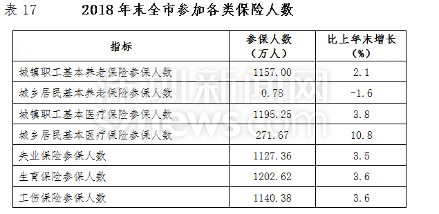 年末全市有1157.00万人参加了城镇职工基本养老保险,1127.36万人参加了失业保险。
