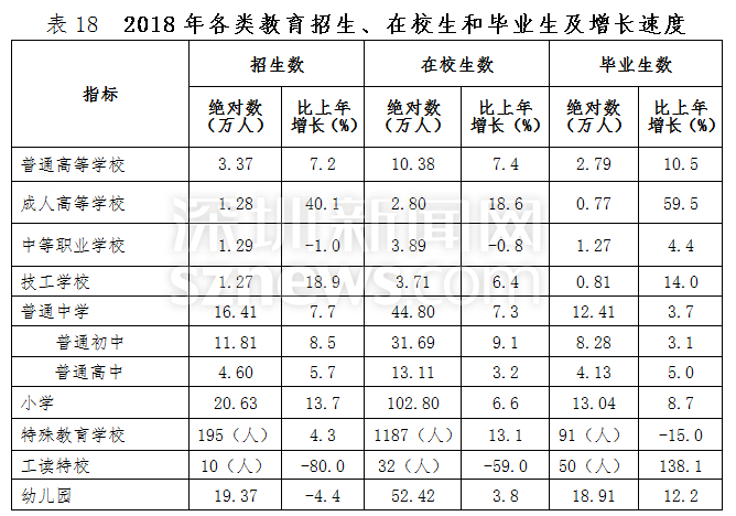 年末全市各级各类学校总数达2551所,比上年增加114所;毕业生50.02万人,招生63.63万人,在校学生220.92万人,分别增长9.3%、5.9%和6.1%。年末全市有幼儿园1771所,增加88所;在园幼儿52.42万人,增长3.8%。有小学344所,增加2所;在校学生102.80万人,增长6.6%。有普通中学390所,增加22所;在校学生44.80万人,增长7.3%。有普通高等学校13所,增加1所;在校学生10.38万人,增长7.4%。