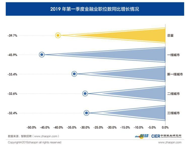 此外,调研显示,备受瞩目且高薪的金融行业本季度就业状况并未随着股市的回暖同步好转。根据智联招聘大数据,金融业2019年一季度的招聘职位数降幅在所有行业中最高,达39.7%。其中一线城市金融行业职位数的降幅最大,为45.9%,新一线、二线和三线城市的降幅均在33%左右。2017年以来,强化监管成为金融领域的主基调,在去杠杆、防风险的同时,金融行业发展速度有所放缓,向市场提供的就业机会也整体下降,这在互联网金融等新兴业态主要活跃的一线城市表现更为明显。
