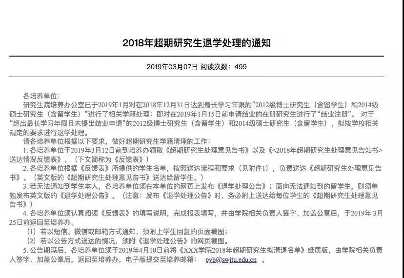 对于"超出最长学习年限且未提出结业申请"的2012级博士研究生(含留学生)和2014级硕士研究生(含留学生),拟按学校相关规定的要求进行退学处理。