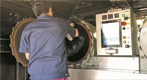 "除了金属、玻璃、陶瓷等无机垃圾外,像常见的塑料,木屑,皮革,衣物以及剩菜剩饭在这个6米多长的小"集装箱"全部可以消化,日常操作只需要一个操作工人,一台基本可以解决一个小区的日常生活垃圾。"现场工作人员一边操作一边向记者讲解,通俗的来讲,MAX-01主要工作就是把一袋袋放进去的垃圾烧成可以当作化肥的灰渣。相比于一般的垃圾焚烧处理,MAX-01整个处理过程只需要10分钟左右,而且生产出来的的"三废"(废气、废水、碳灰)无色无味,达到欧盟以及中国的排放标准。