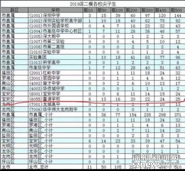 就网上传出深圳高三二模数据图,记者向深圳某中学老师证实了该表格的真实性。从数据中可看到,深圳二模全市前十共有11名,其中富源6名,深圳中学3名,深圳实验学校和市高级中学各占1名。有家长质疑这是富源学校从衡水中学引入了高考移民,才导致二模成绩一下子拔尖,并已申请要求有关部门彻查。