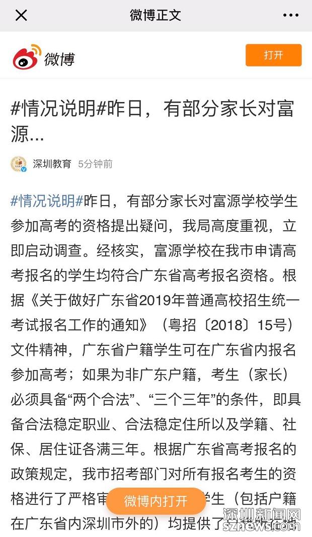 昨日,有部分家长对富源学校学生参加高考的资格提出疑问,我局高度重视,立即启动调查。经核实,富源学校在我市申请高考报名的学生均符合广东省高考报名资格。根据《关于做好广东省2019年普通高校招生统一考试报名工作的通知》(粤招〔2018〕15号)文件精神,广东省户籍学生可在广东省内报名参加高考;如果为非广东户籍,考生(家长)必须具备“两个合法”、“三个三年”的条件,即具备合法稳定职业、合法稳定住所以及学籍、社保、居住证各满三年。根据广东省高考报名的政策规定,我市招考部门对所有报名考生的资格进行了严格审核。富源学校学生(包括户籍在广东省内深圳市外的)均提供了户籍所在地公安部门及我市学籍管理部门对其户籍、学籍的审核证明,手续齐全、资料完整,符合在深圳参加高考的报名条件。