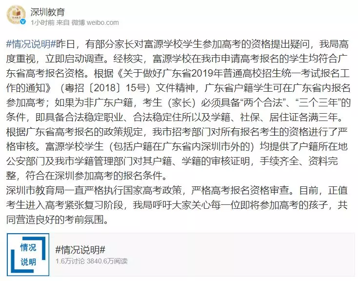 该回应称:经核实,富源学校学生均提供了户籍所在地公安部门及我市学籍管理部门对其户籍、学籍的审核证明,手续齐全、资料完整,符合在深圳参加高考的报名条件。