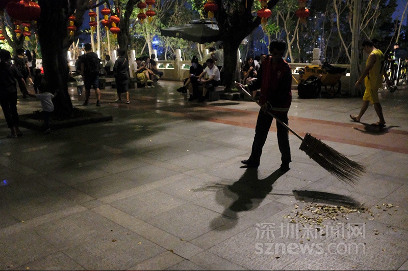 21时,灯光秀结束后,莲花山公园山顶广场打扫卫生的环卫工(杨浩翰 摄)