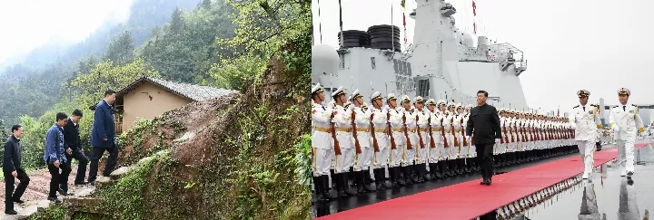 左图为4月15日下午,在重庆石柱土家族自治县中益乡华溪村,习近平踏着湿滑的石阶登上陡坡,前往贫困户谭登周家看望(谢环驰摄);右图为4月23日,习近平出席庆祝人民海军成立70周年海上阅兵活动(李刚摄)