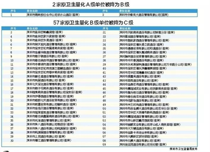 5、深圳市卫生监督部门自2018年12月开始集中开展专项整治行动。截至目前,行动中共检查1660家酒店业单位,责令限期整改224家,立案95宗,共有59家单位在卫生信誉等级评定复审工作中被予以“降级”,其中不乏部分知名连锁酒店业单位。