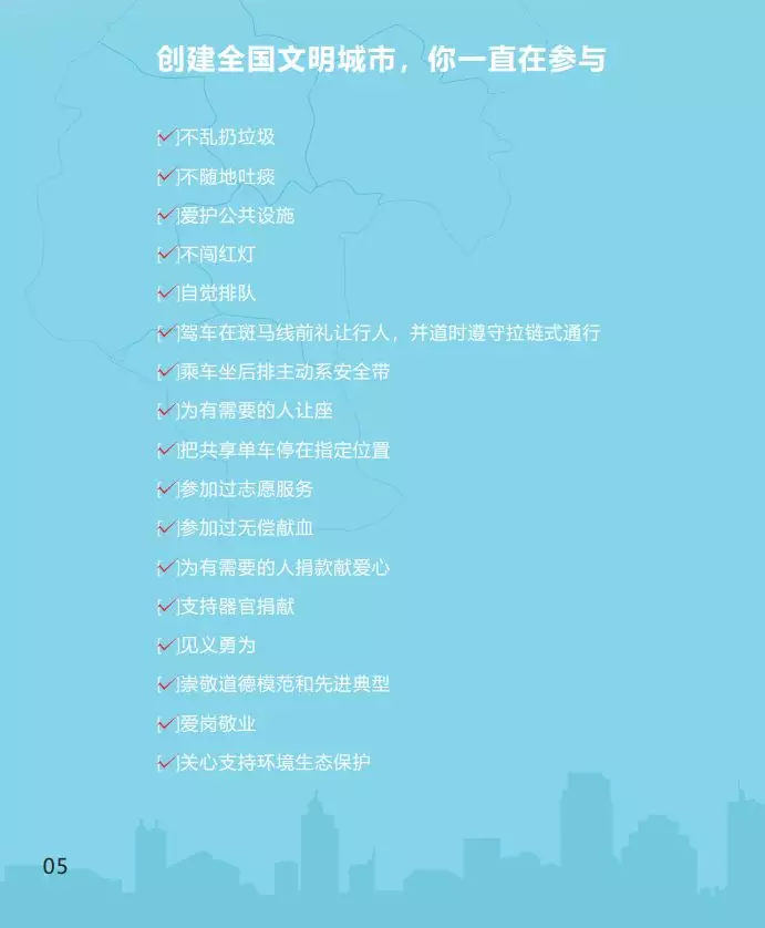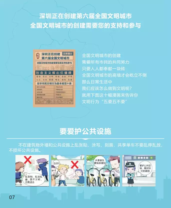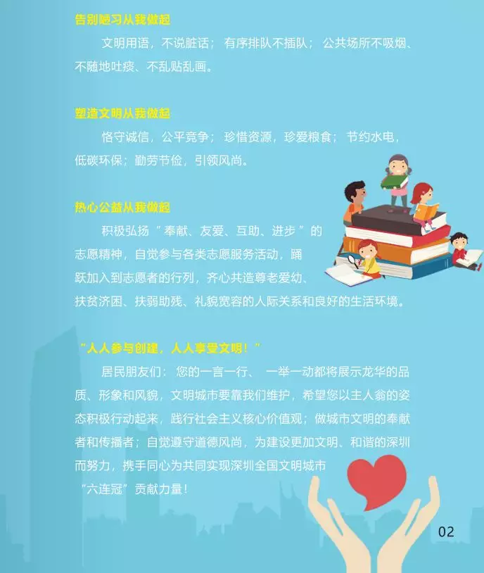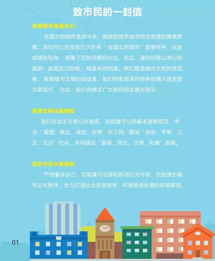 近年来 随着全国文明城市创建的深入推进 龙华区“创文”给这座城带来巨大改变 城市基础设施不断完善 城区环境面貌不断美化 市民文明素质不断提升 …… 看得见、摸得着的 是真真切切的舒适感和幸福感 “人人参与创建,人人享受文明” 为进一步提升龙华区市民 对创建第六届全国文明城的知晓率和满意度 龙华区委宣传部(文明办)设计推出 《市民文明手册》 和《致市民的一封信》宣传折页 将陆续发放到市民朋友手中 什么是“创文”? 我们怎么做到文明? 现在,发布君带你提前了解~ 我们每个人既是“文明城市”的缔造者 更是“文明城市”的受益者 当文明成为大家的日常 在龙华生活会越来越幸福~ 龙华小伙伴 “创文”路上,我们一起接力传递!