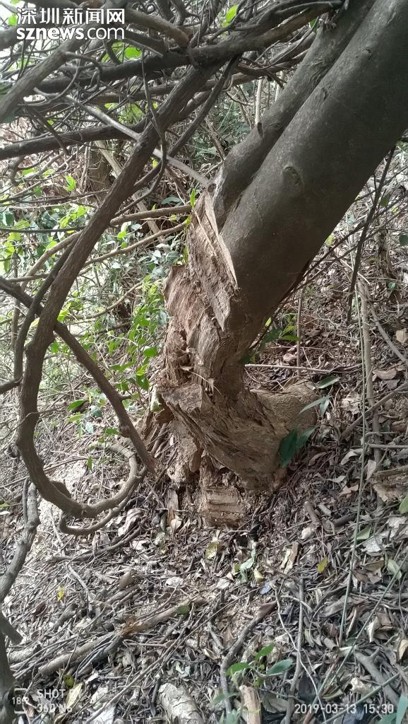 该网友提及的应人石村位于深圳石岩,从地图上看,其“后山”与羊台山森林公园连为一体,是附近居民闲暇时度假踏青的重要选择。据了解,网友“诗奴L”于今年3月中旬上山游玩,游玩途中发现原本茂盛的野生沉香树大多遭人砍伐。“不法分子穷尽一切手段,用钻、削、劈、锯等来对沉香树进行摧残,这简直是屠杀式的洗劫!”该网友表示,看到这么多野生沉香树被残暴砍伐,真地让人很气愤。