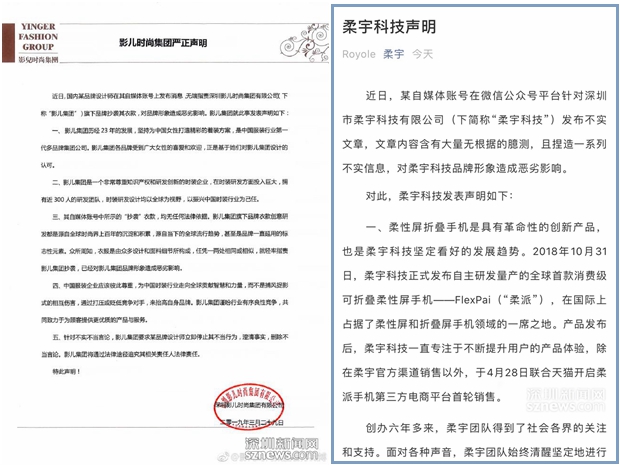 影儿时尚集团(左)和柔宇科技(右)声明页面截图