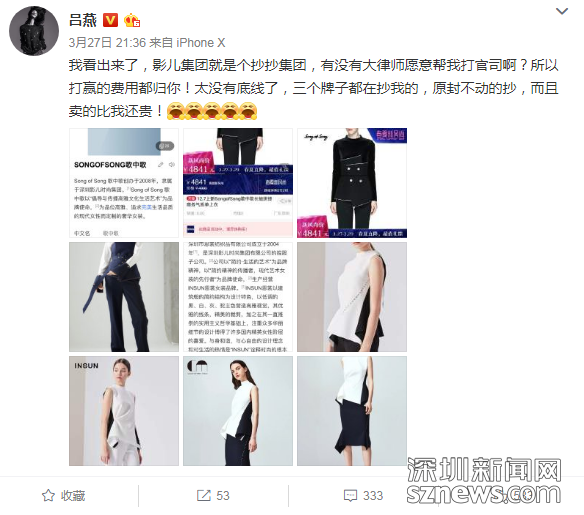 无独有偶。5月5日,深圳影儿时尚集团(以下简称:影儿集团)正式向深圳市中级人民法院提起诉讼请求,就超模吕燕多次在微博上指责影儿集团是“抄抄集团”,造成影儿集团重大名誉损失和巨额经济损失一事,起诉超模吕燕及其公司上海是你商贸有限公司不正当竞争,要求两被告立即停止侵权行为,赔偿经济损失1000万元,并公开道歉。