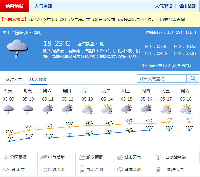 市气象局预计,9日深圳以阴天天气为主,有中到大雨,局部暴雨;气温在19-23℃;沿海、高地和海区最大阵风6-7级。10-11日以多云天气为主,有短时阵雨。12日起多云,气温明显回升。