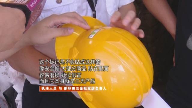 在新环美五金批发店,销售的所有安全帽,除了写有一个“安鉴”的字样外,就再没有任何标识,而且“安鉴”标志粘贴也不符合规范,明显也属于三无产品。
