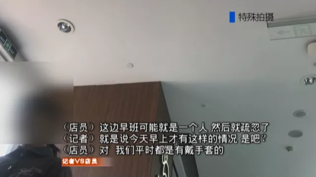 该店的同事赶紧进到厨房进行提醒,这名店员随后也急忙戴上了手套!