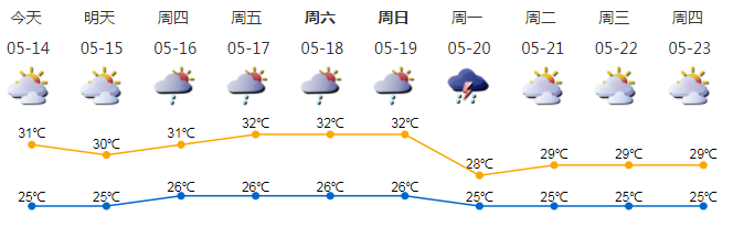 我市多云,早晚有轻雾;气温25-31℃;偏南风2-3级;相对湿度55%-95%
