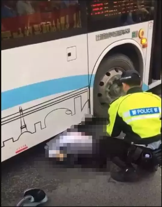 从报料市民拍到的现场画面可以看到,在一个右转弯路口处,一辆公交车疑似和一名路人发生了碰撞,一名身穿白色上衣的女子倒地,几乎整个下半身都被卷入了公交车底,女子脸上和身上都有明显血迹,身旁一位交警在照看着她。
