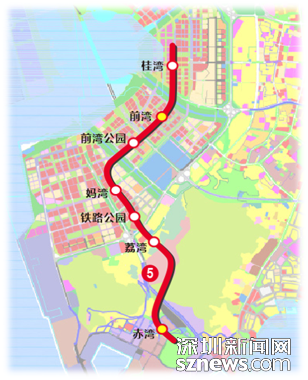 深圳地铁5号线二期工程从已投入运营的地铁5号线终点站前海湾站向南延伸,至2号线赤湾站为止,共设7站7区间,全长7.6公里,自北向南贯穿前海新区。其中,换乘站3座,可与地铁2、9、15号线换乘。