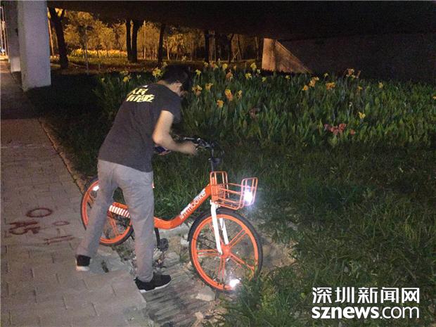 摩拜运维人员回收深圳会展中心周边区域附近绿化带、机动车道上滞留的单车