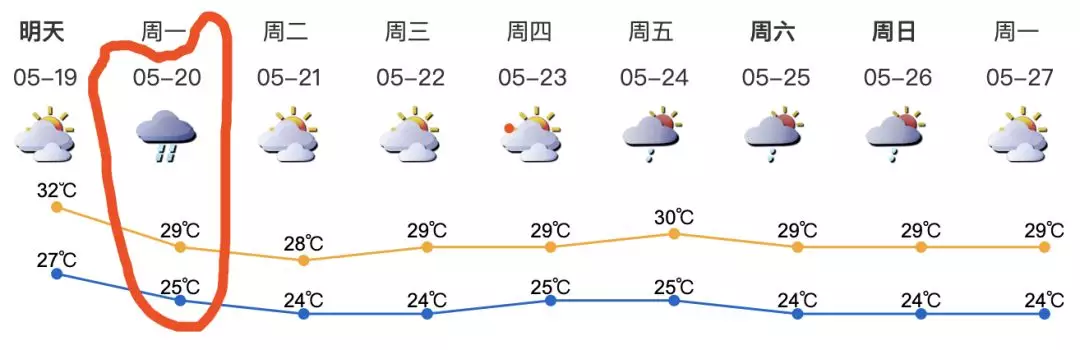 19日多云,局地有短时阵雨或雷雨,天气闷热;20日有一次明显降雨过程,局部地区有暴雨,伴有雷暴大风。21日起转多云,气温略降↓,闷热天气缓解。