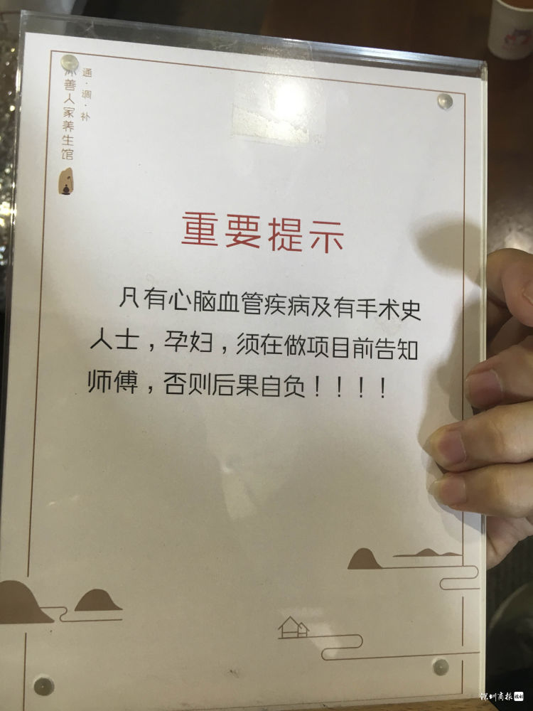 5月22日,读创 /深圳商报记者来到了该养生馆,该养生馆仍在正常营业。记者发现,店家在桌子上摆放了重要提示:凡有心脑血管疾病及有手术史人士、孕妇,须在做项目前告知师傅,否则后果自负!李小姐告诉记者,这是她母亲出事后才增加的,正骨等项目已被店家从美团上撤下。