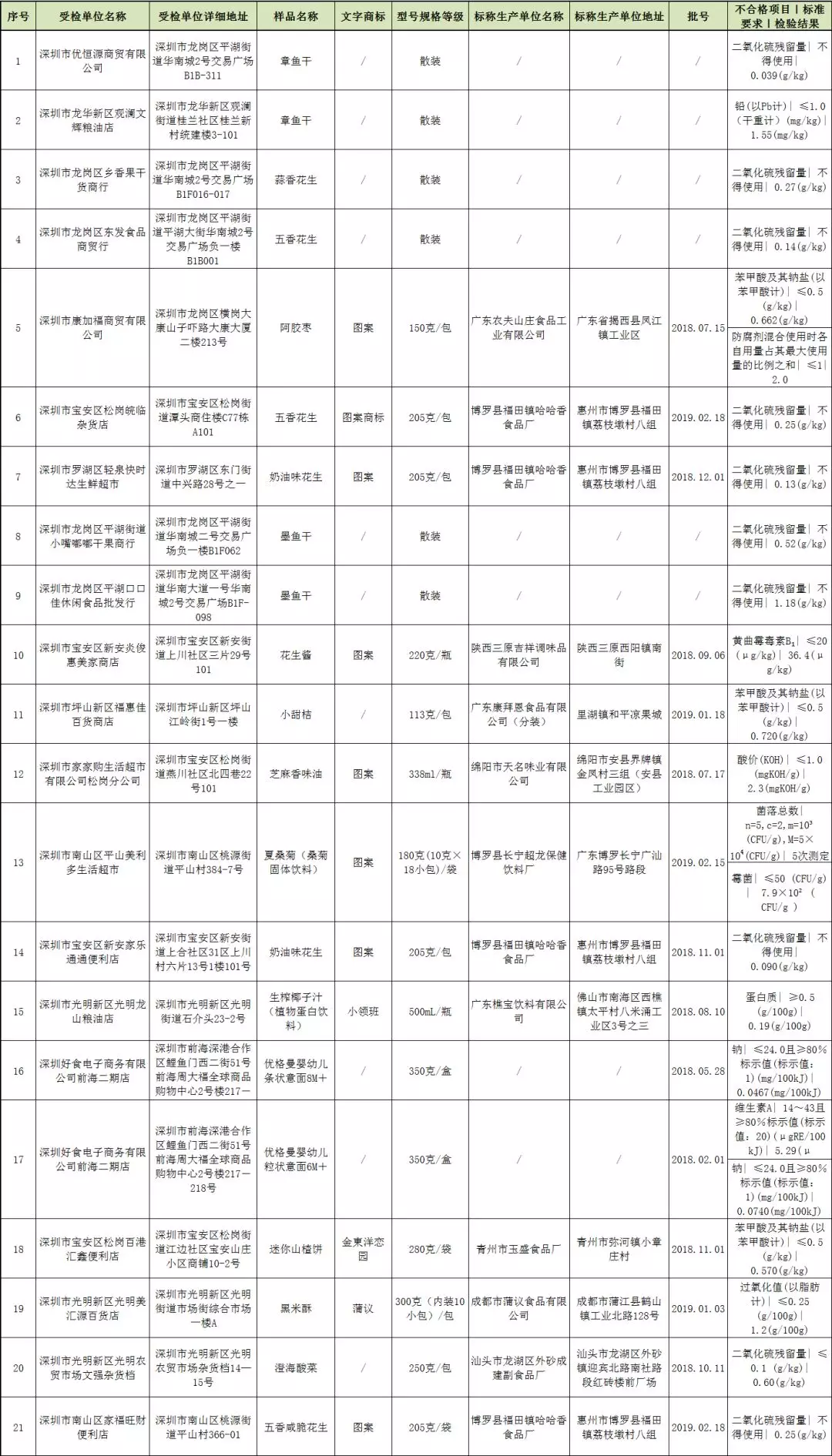 本次共抽检流通环节食品2455批次,涉及流通环节经营主体870家次,共检测食品指标14705项次。其中检出不合格样品21批次,涉及不合格食品类别有炒货食品及坚果制品6批次,食用油、油脂及其制品1批次,蔬菜制品1批次,薯类和膨化食品1批次,水产制品4批次,水果制品3批次,特殊膳食食品2批次,调味品1批次,饮料2批次;涉及不合格项目类别为金属等元素污染、微生物污染、食品添加剂、品质指标、生物毒素污染。