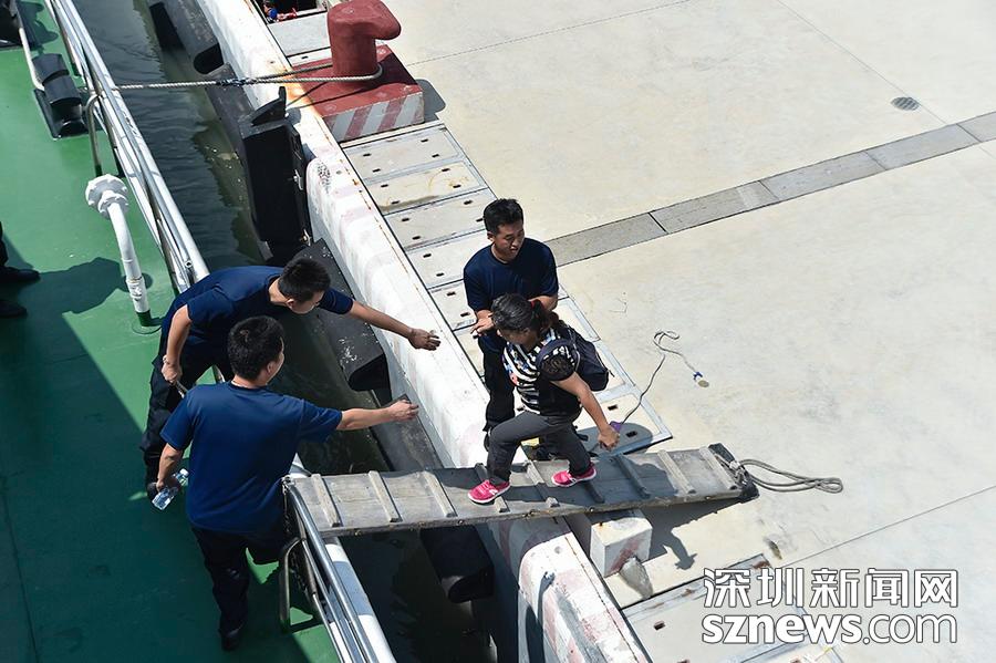 海监船员协助本次参观的市民上船