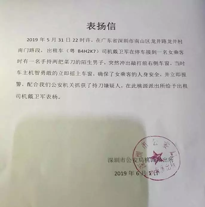 由于戴卫军的冷静处理,这起治安隐患事件发生不到半小时,涉案嫌疑人就被警方成功抓获归案。为了赞扬戴卫军见义勇为的义举,桃源派出所还专程向戴卫军送上了表扬信。