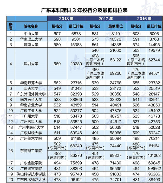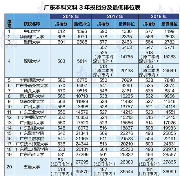 只能给大家找来广东本科文理科3年投档分和最低排位表!(部分)