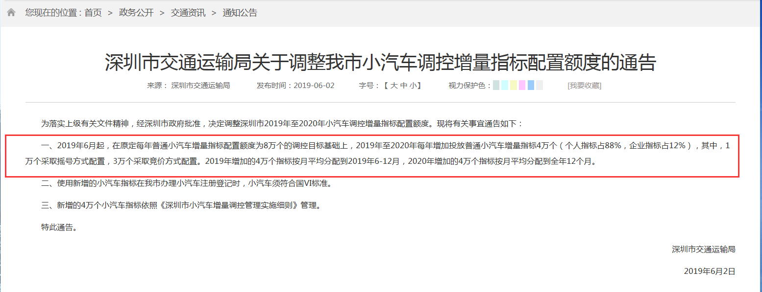 6月2日,深圳市交通运输局发布了关于调整我市小汽车调控增量指标配置额度的通告