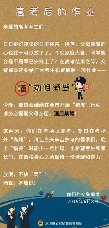 深圳新闻网2019年6月10日讯(记者 高畅韵)高考圆满结束,很多有考生的家庭做的第一件事,就是带上家人朋友聚聚餐,犒劳一下孩子跟自己。但放假不放“驾”,孩子们有努力完成考试,父母们有乖乖地酒后不开车吗?这不,高考结束当晚,就有14只"醉猫"被抓获······