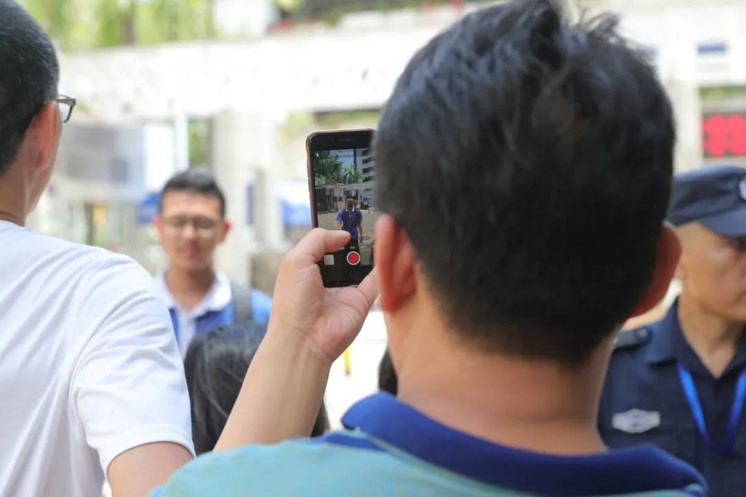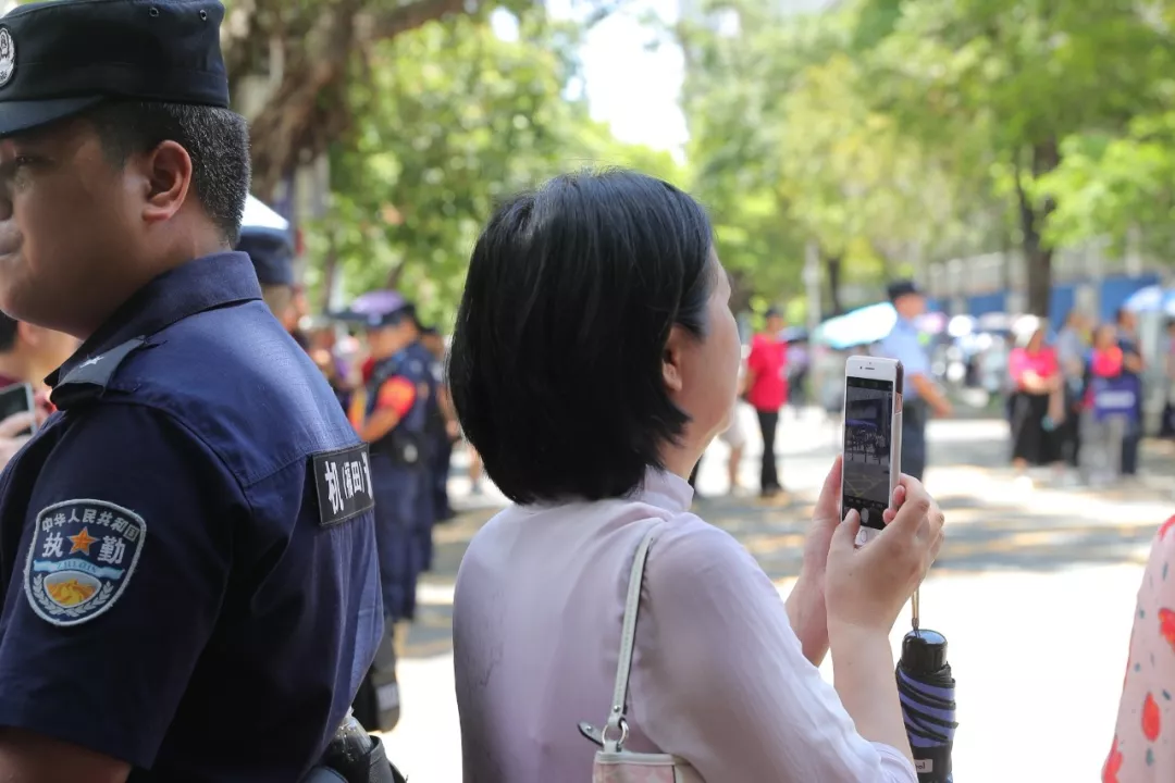△考场外焦急等待的考生家长纷纷拿出手机准备拍摄迈出考场的孩子。