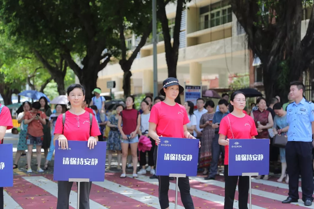 考试开始和结束时,在深圳实验学校中学部的考场外,家长们自发组织的义工服务队也正在有序地维护着考场外的秩序。通心岭派出所积极与本次家长义工服务队的成员沟通,在考试结束后散场时能够快速缓解人流,保证考场周边的秩序。