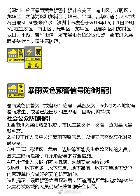 【深圳市分区暴雨黄色预警】预计宝安区,南山区,光明区,龙华区,西部海区和龙岗区(坂田、平湖、吉华街道)3小时内将出现30-50毫米降水,深圳市气象台于2019年06月11日09时15分在宝安区,南山区,光明区,龙华区,西部海区和龙岗区(坂田、平湖、吉华街道)发布暴雨黄色分
