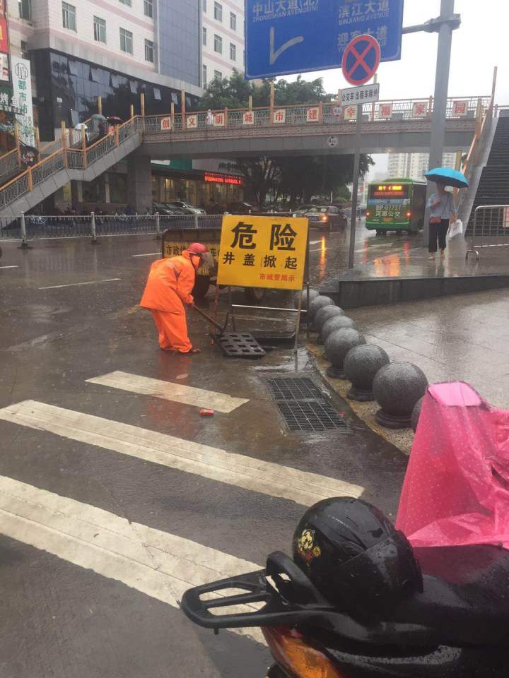 市城管部门已加派工作人员,加班加点,打开华怡路口等易涝点井盖并设置警示牌,加大对市区排水的力度。