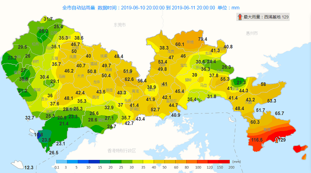 图说:11日深圳全市日降雨量(单位:毫米,截止至11日16时05分)