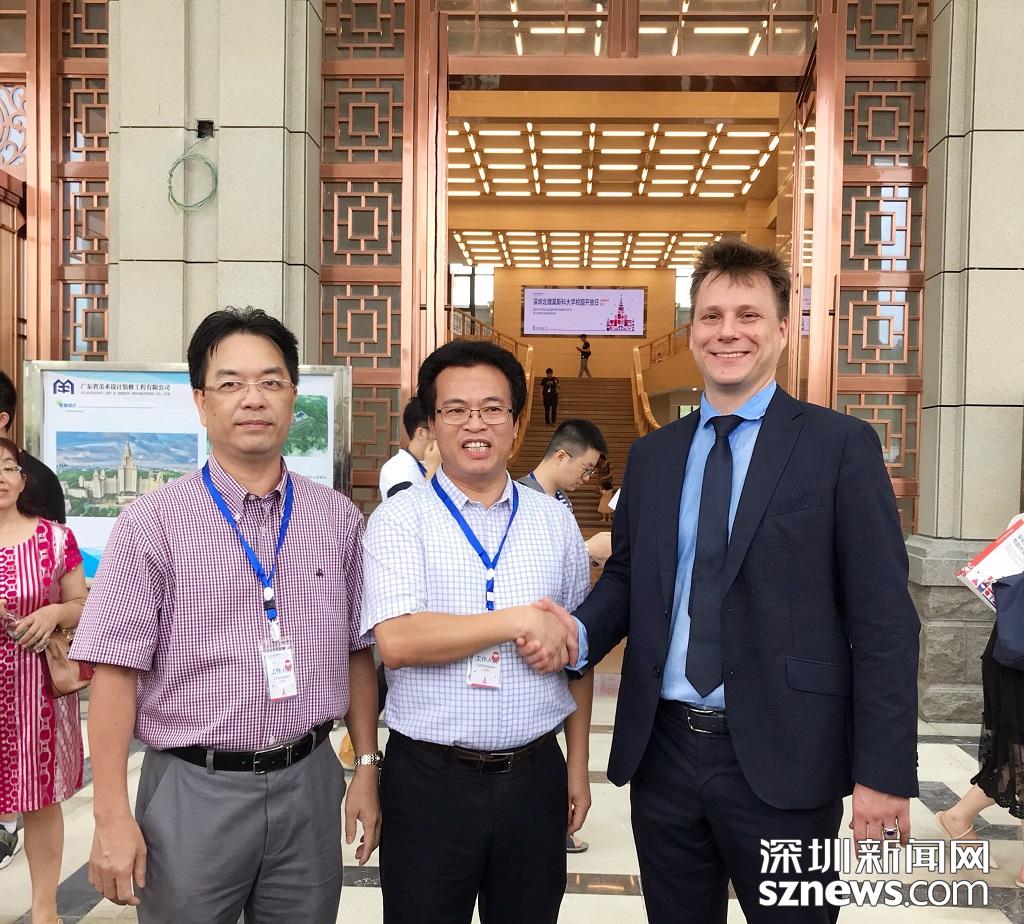 左起:深北莫党委书记、副校长陆万伟,深北莫代理校长唐水源及副校长阿列克谢·塔拉索夫合照