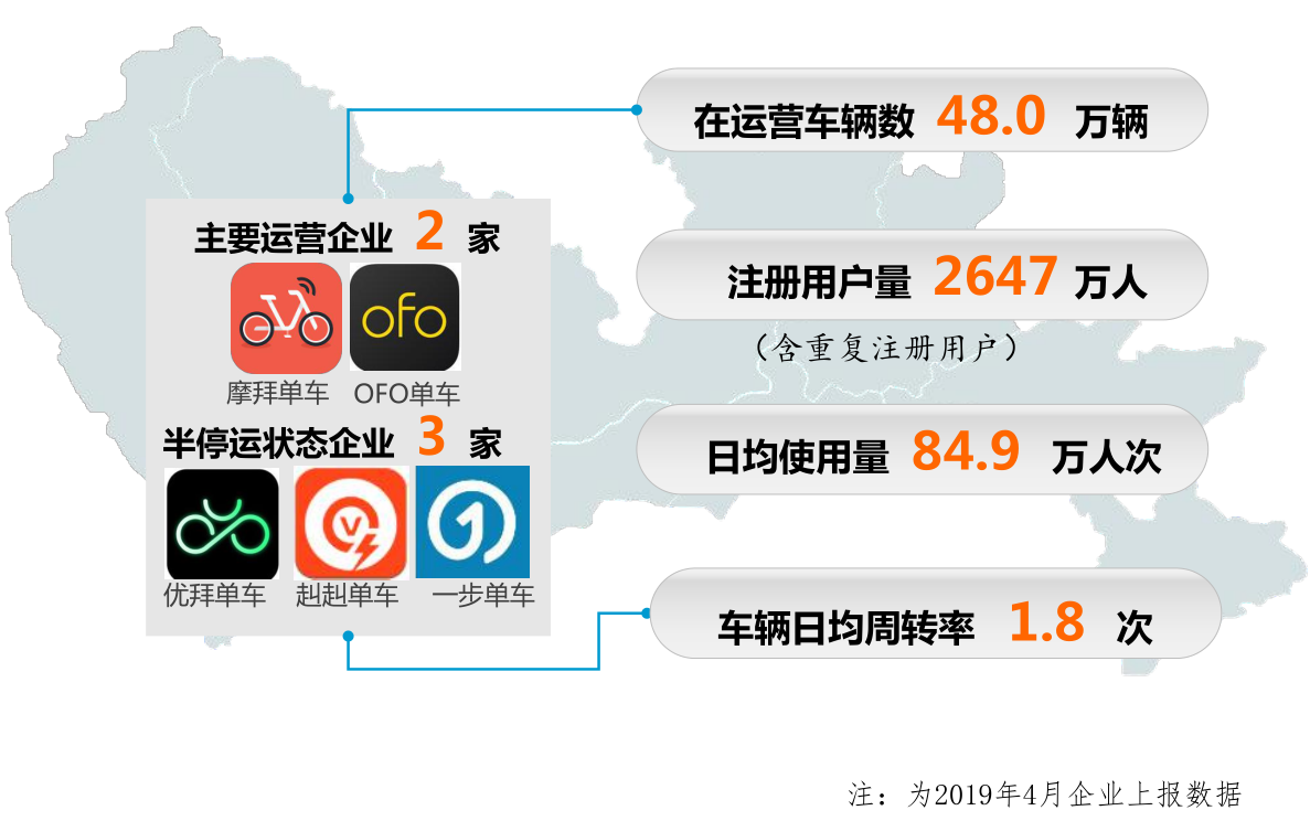 在总体概况方面,《评估报告》表示受资本、政策以及企业营销策略等因素影响,深圳共享单车发展经历了爆发式增长到快速回落,目前已日趋稳定,共享单车在深运营车辆数为48万辆,实际可用车辆规模约37万量,用户注册量2647万人(含重复注册用户),日均使用量84.9万人次,车辆日均周转率1.8次。其中在深主要运营企业为摩拜单车和ofo单车,其余优拜单车、赳赳单车、一步单车已处于半停运状态。