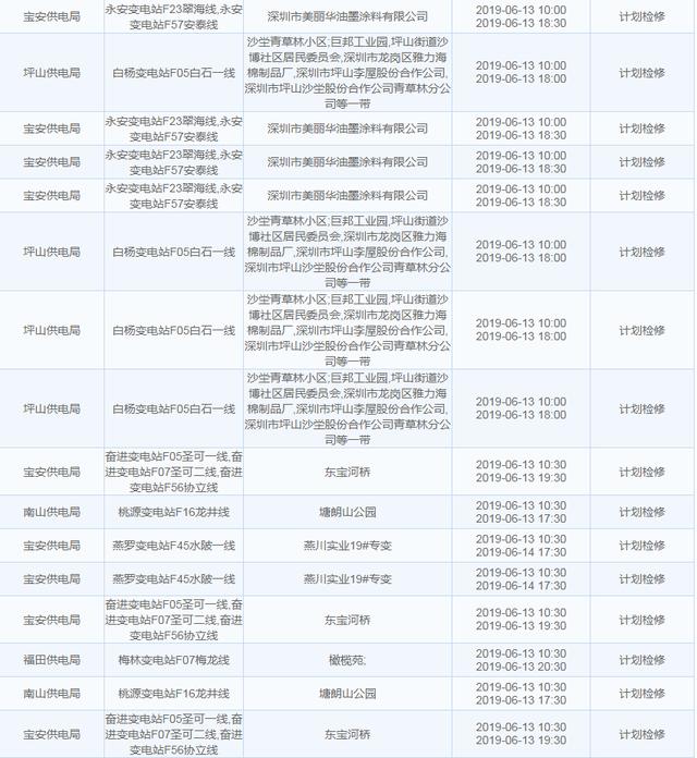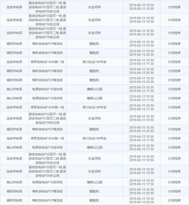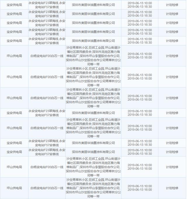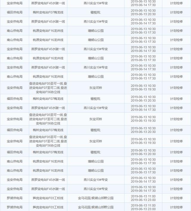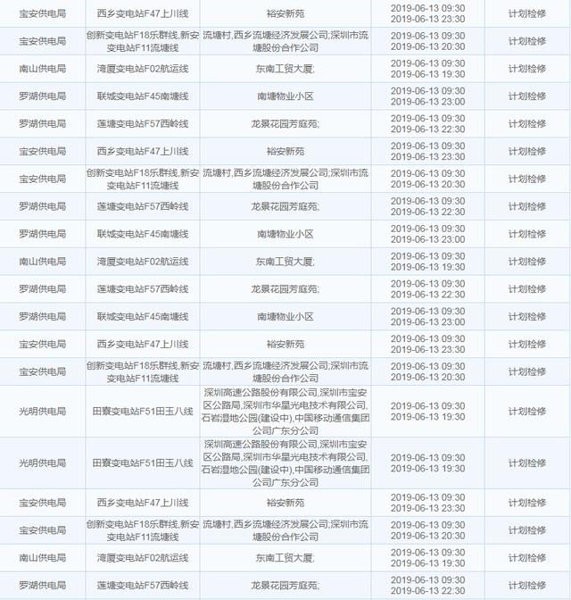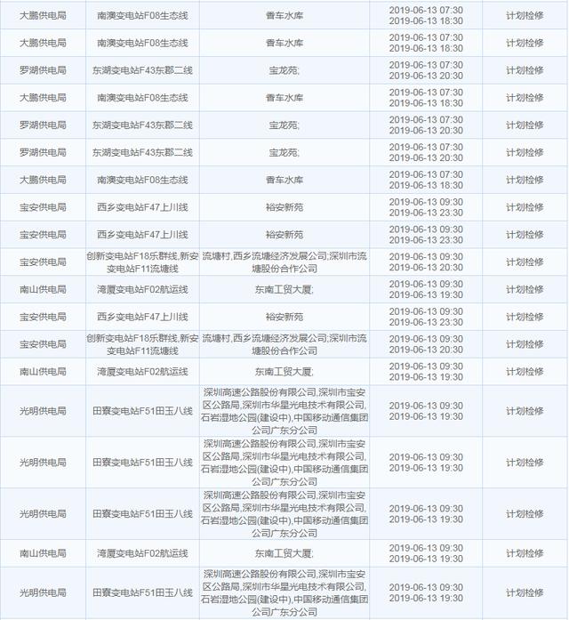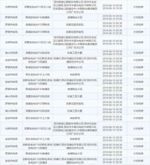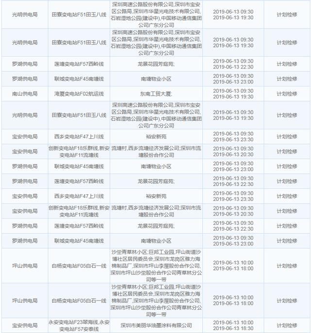 南方电网发布6月13日至6月16日深圳停电计划 涉及多个区