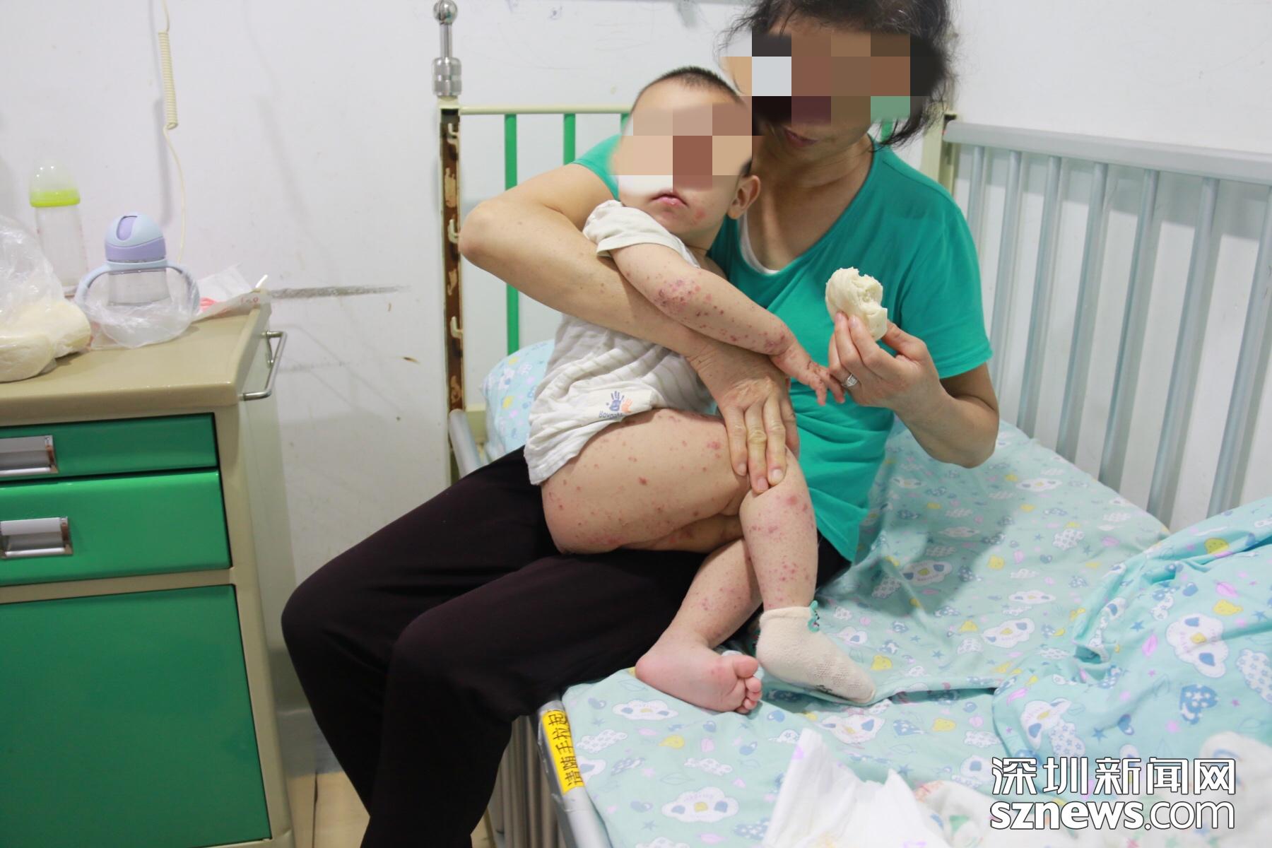 在深圳市儿童医院感染科病房,一名患有手足口病重症的幼儿身上多处部位出现大片红疹。