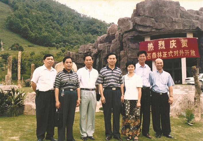▲1999年,仙湖植物园化石森林景区正式对外开放,陈谭清(右二)与同事在景区前合影。