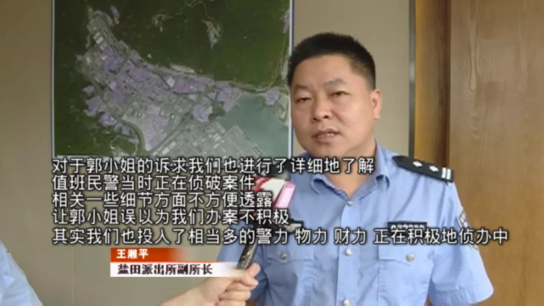 派出所表示,案件正在侦查当中记者也和郭女士来到盐田派出所,由于负责此案的蔡警官正值休假,派出所的一位值班领导,对郭女士当时所遭遇的处境,进行了情况说明。