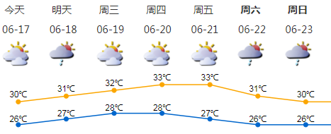 我市多云转阵雨;气温26-30℃;东南风2-3级,阵风5-6级;相对湿度70%-90%