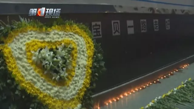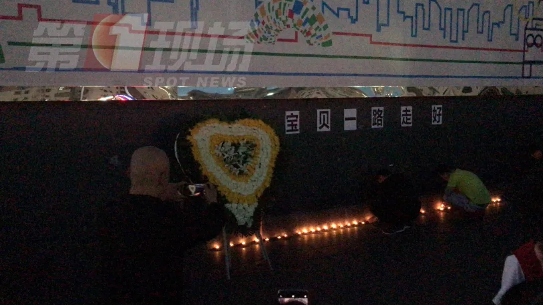 在广场正中央,放立着一个心形花牌,大家在地上点上了蜡烛,墙面贴着“宝贝一路走好”。