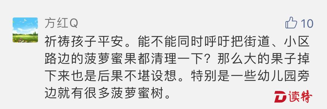 一南光苑小区居民告诉记者,前阵子确实发现枝头挂着很多成熟的菠萝蜜,一天晚上经过时,她还看见一颗果实从树上掉下,瞬间在地上裂开,喷出稍许汁液,虽然没有伤到人,却也让附近居民有些后怕。幸好几日前已经有工作人员来将果实打下,不然经过总要提心吊胆。