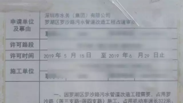 现场的一份施工告知书显示,正在施工的这项工程,属于水务集团罗沙路污水管道改造工程,获得了占用道路挖掘许可。工程周期从5月15日开始到6月29日截止,一共45天。