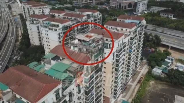 视频中记录的空中“碉堡”位于福田天泽花园里的一栋居民楼顶层,小高层共12层,加建的楼房远高于楼房常规屋顶!
