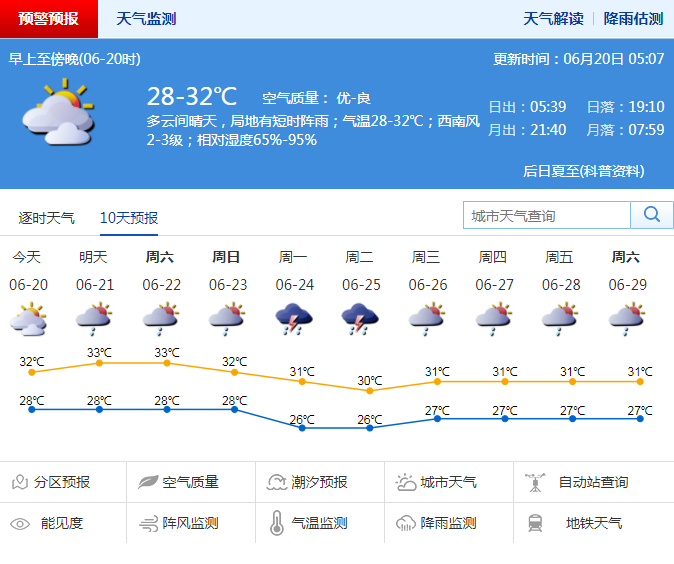深圳新闻网2019年6月20日讯 19日深圳阳光阵雨相伴。早晨和中午前后出现阵性降水,雨量普遍在10毫米以下,全市最大雨量32.7毫米,出现在宝龙街道三棵松站,这也是唯一一个大雨点。早晨最低气温26-28℃,白天最高气温在31-33℃,宝安区西北部达34-35℃,湿度较大,体感闷热。